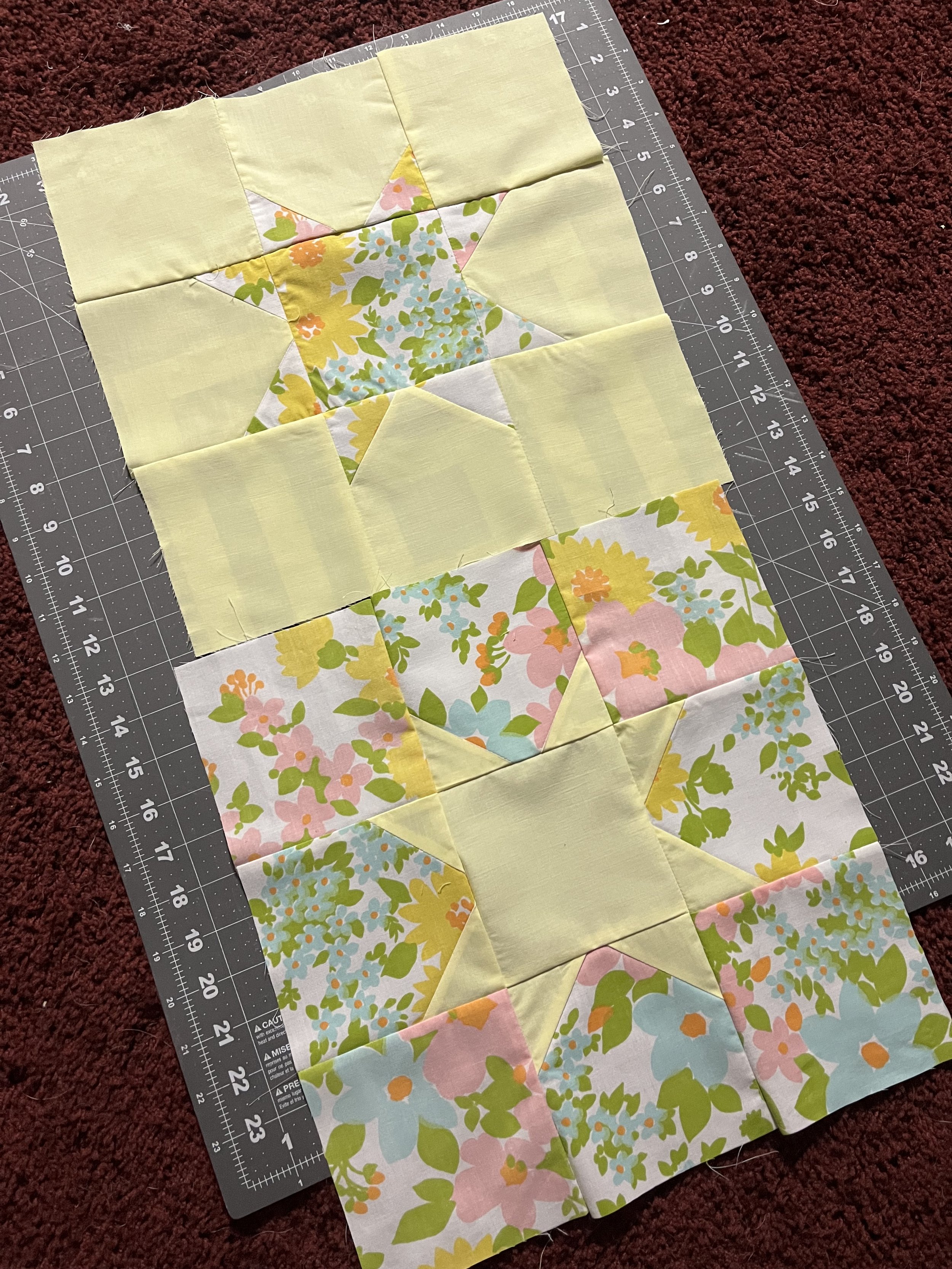 There are many styles of star quilts, but I started with a simple 8 point design. I had thrifted some vintage bedsheets and had been waiting for the perfect opportunity to use them, this quilt seemed like just the thing. It was started to get to the end of spring and the pastel colors with the floral pattern felt like the perfect fabric for an ‘End of Spring’ quilt. While it was my first time doing a star pattern, I have to say, it was easy! As long as your measurements are precise and you line everything up correctly you can’t go wrong. The main challenge I did have...working with bedsheets. Especially older, softer sheets. They have much less structure than new quilting cotton, and slip around a lot easier. But in the end, it was so worth it.