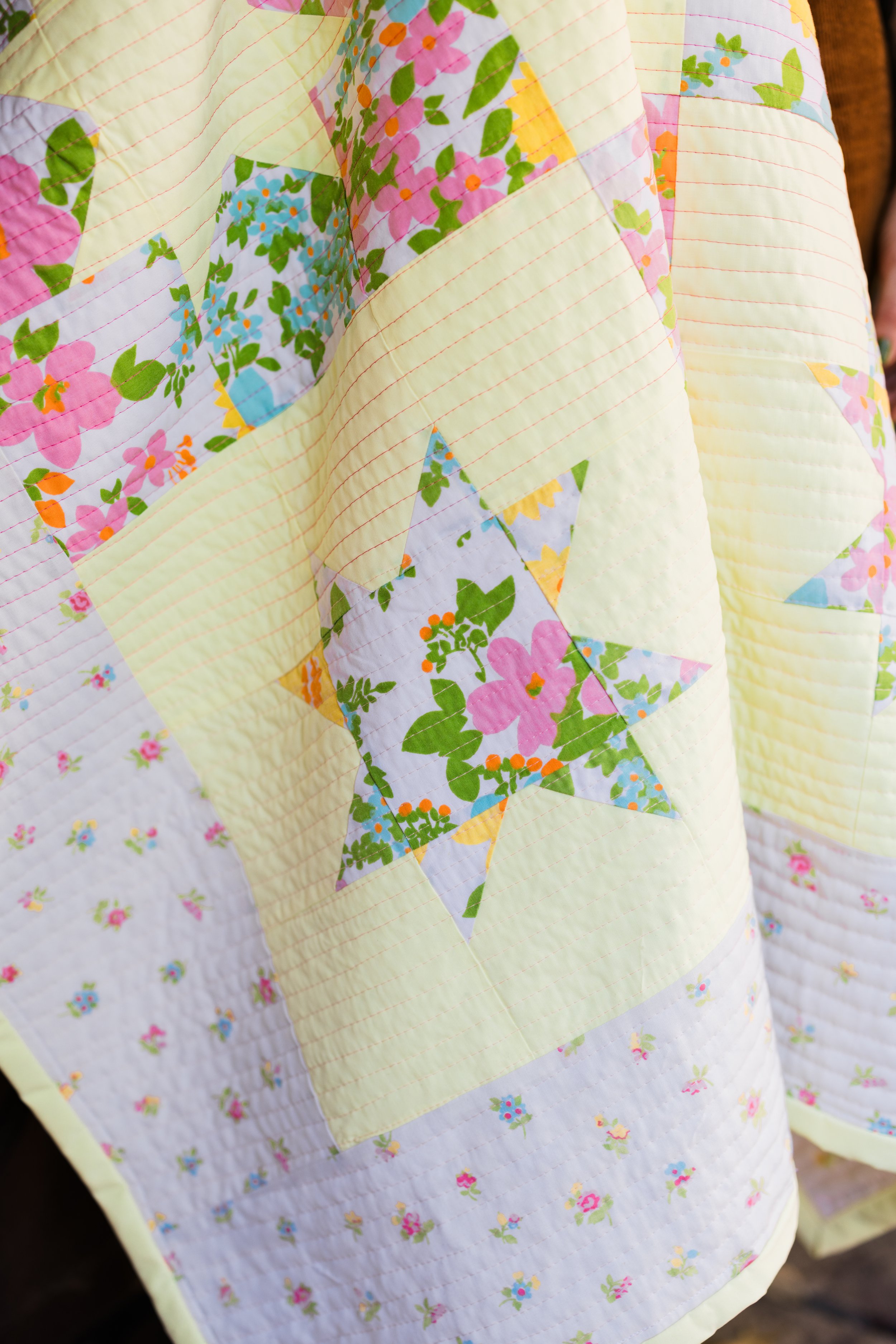 For a quilt that I didn’t really plan-out, I have to say, it’s one of my favorites. It might even be my favorite. I challenged myself to use only what I had: three vintage bed sheets, multiples different colored threads, and leftover batting from previous projects. I love the colors, the way they were all purchased separately but feel so cohesive. I love the soft touch from the bed sheet fabric. There is something very “spring time, front porch, sipping sweet tea” vibe to it that I absolutely adore.