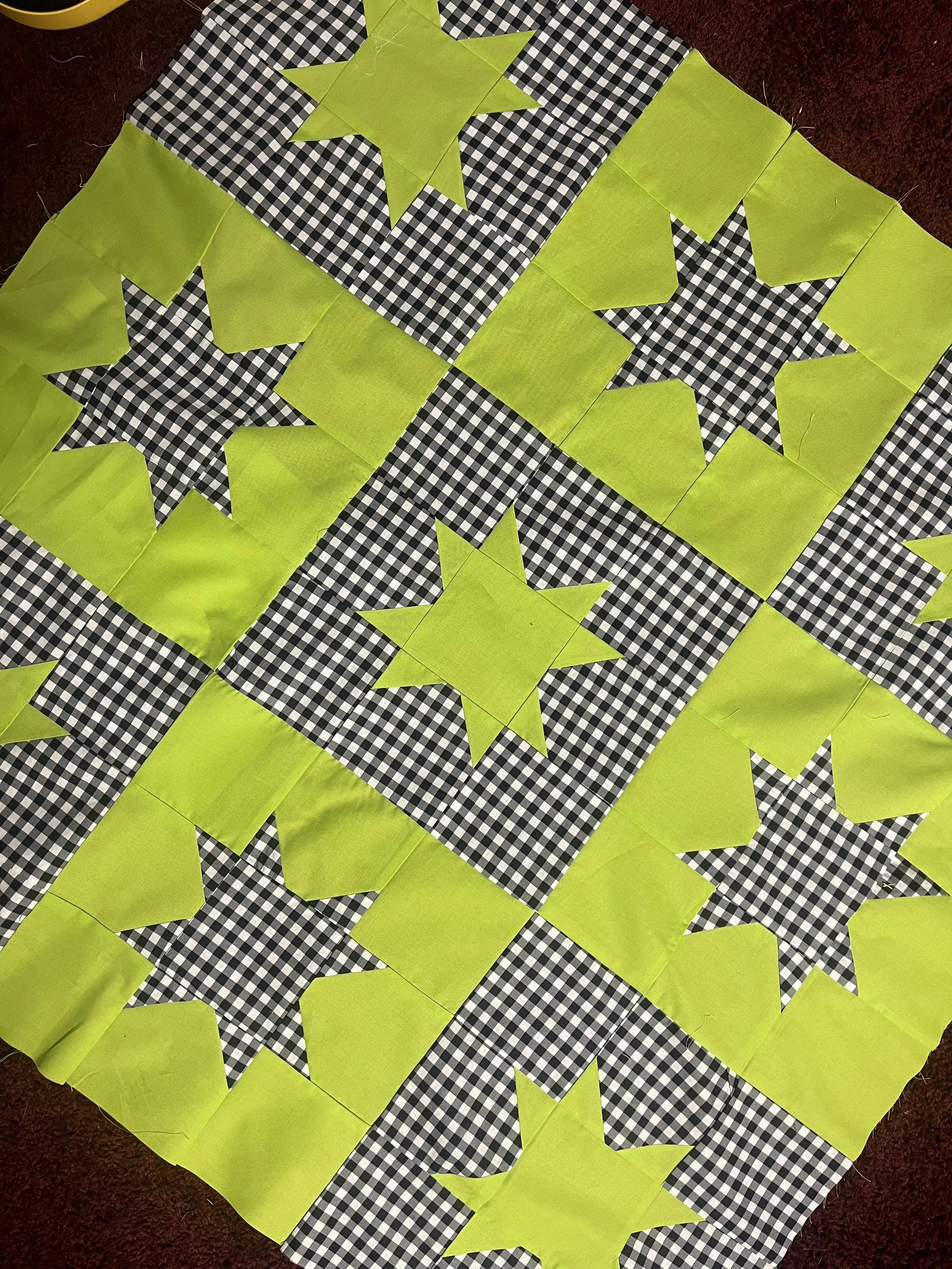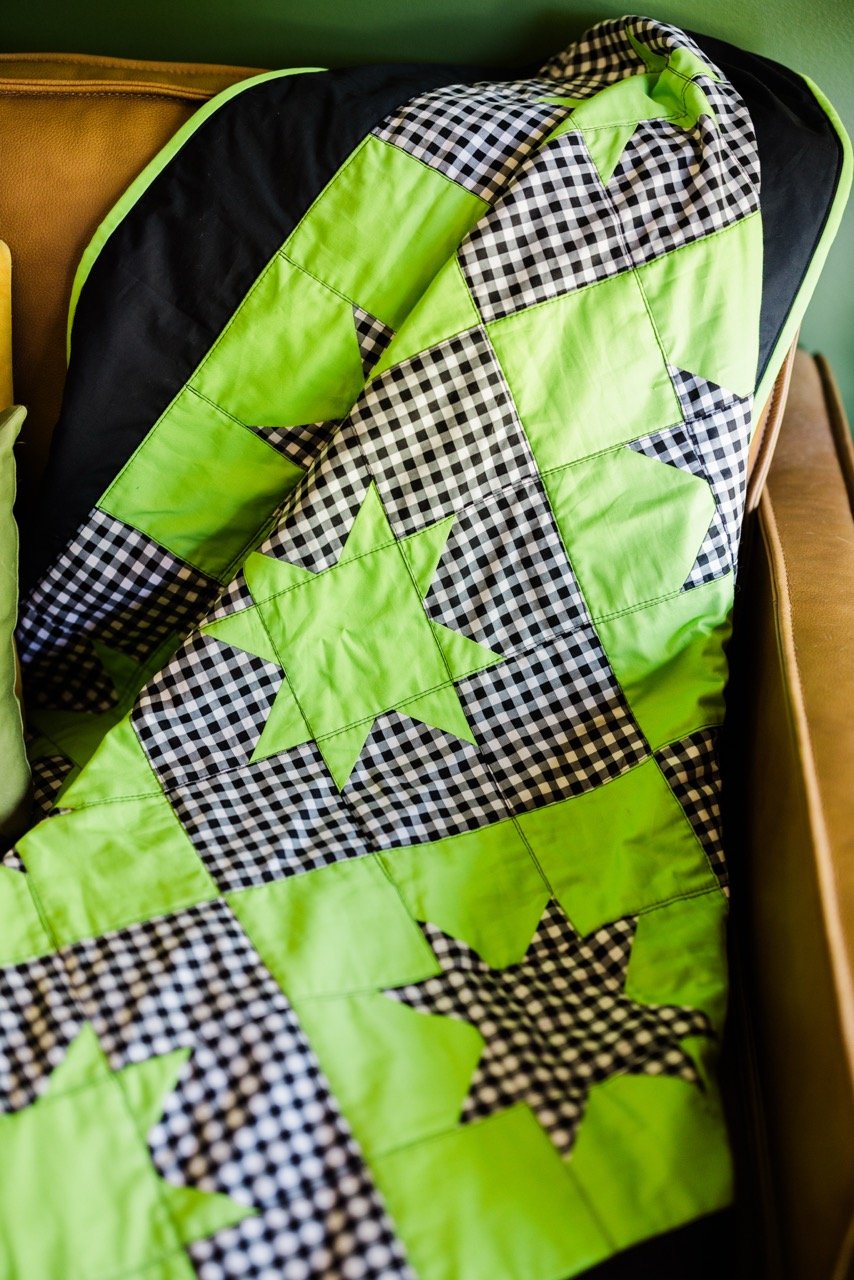 While the pattern is simple, the color palette is what shines for me. The black gingham reminds me of a classic picnic blanket, but the green is kinda of giving “slime,” so the name “Slime Picnic” was born. While I love a complex quilt pattern, there is something beautiful in the simplicity of a minimal star quilt.